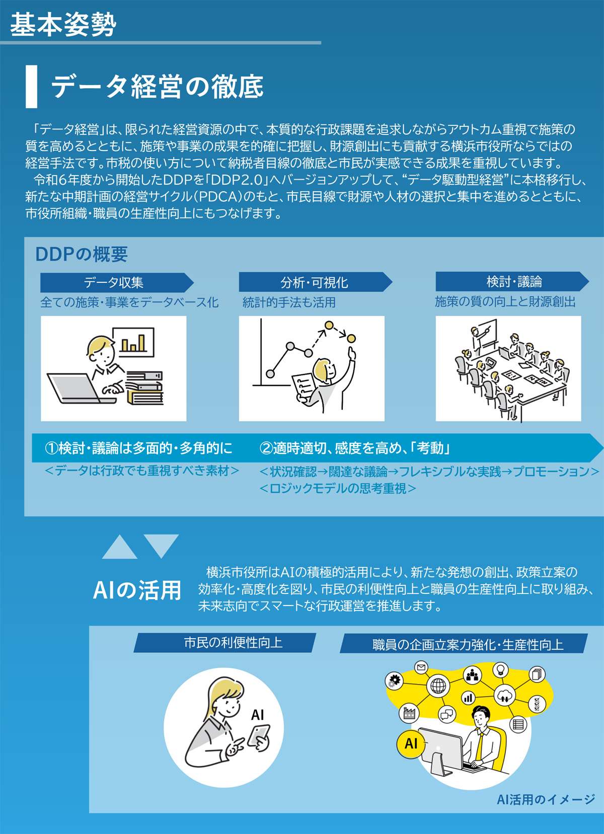基本姿勢として「データ経営の徹底」に取り組むことを明記し、データの活用により施策の質と効果を高め、その成果を市民の暮らしに還元していく考えです。
