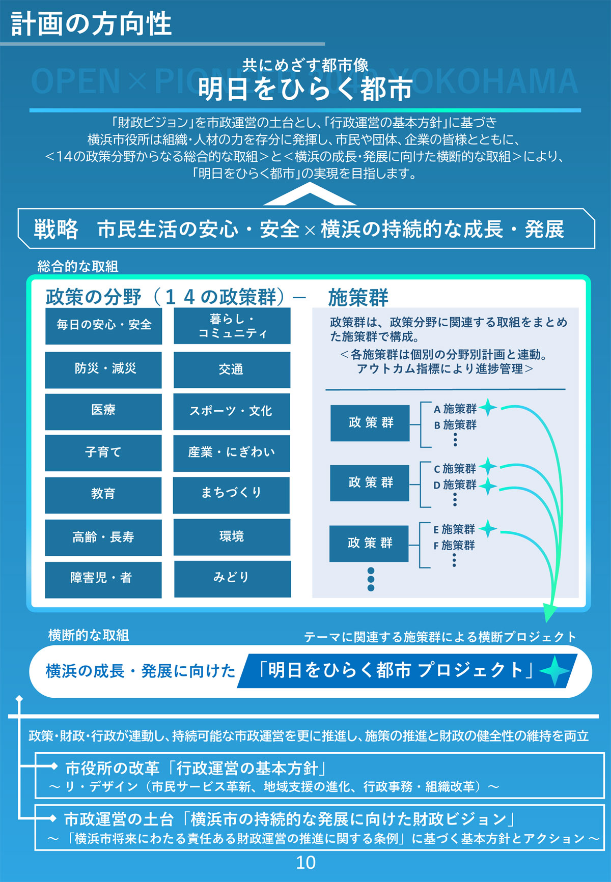 戦略として「市民生活の安心・安全×横浜の持続的な成長・発展」を掲げ、「総合的な取組<14の政策群>」と「横断的な取組<明日をひらく都市プロジェクト>」により、明日をひらく都市」の実現に取り組むといいます。