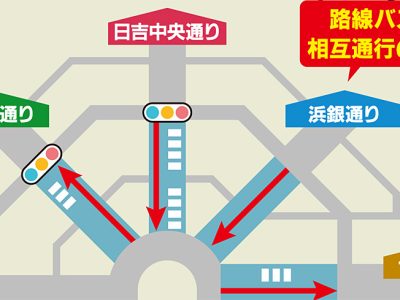 日吉駅前(西口=商店街側)から放射状に広がる「普通部通り」「日吉中央通り」「浜銀通り」「サンロード」の4つの道路について、駅前(ロータリー)から700メートル程度にわたって一方通行に変わります。